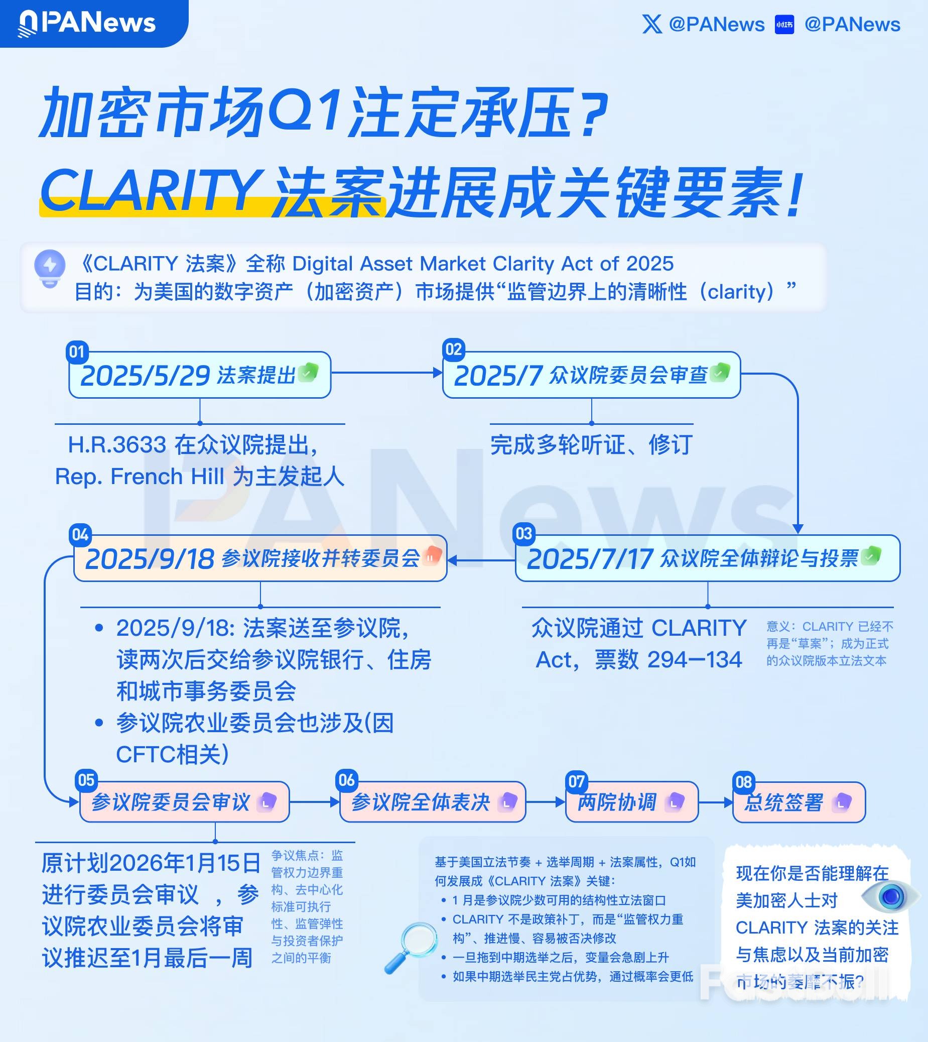 2026年1月末,旨在为美国加密货币市场建立监管框架的《CLARITY法案》在美国参议院农业委员会以12票对11票的微弱优势获得通过。