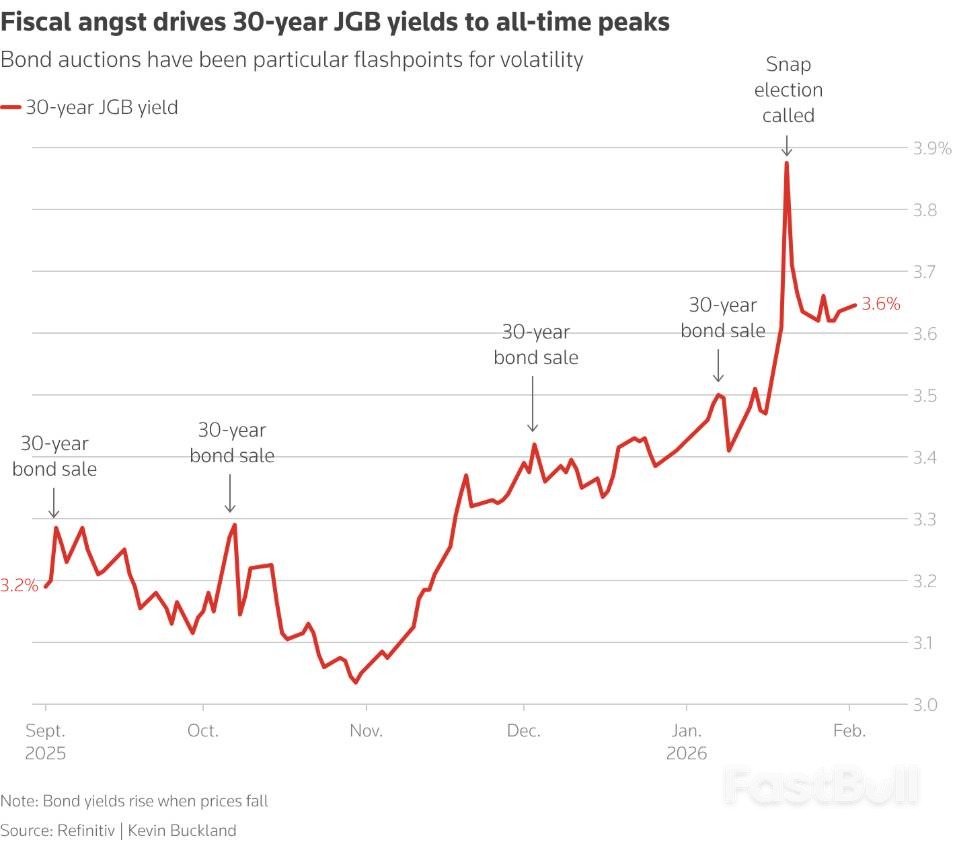 1月20日,高市早苗宣布解散议会并举行大选,同时承诺将暂停征收食品税两年。但由于并未说明如何填补约10万亿日元的收入缺口,这一消息导致30年期日本国债收益率一度飙升至3.88%的历史高点。