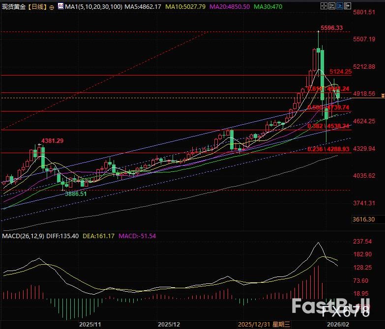 从技术面看,现货黄金反弹至0.618斐波那契分位后遭遇较大阻力。目前价格受到下方上升通道的支撑,上方则面临4941(0.618分位)的压制。更上方的压力位在5124附近,接近0.764分位。