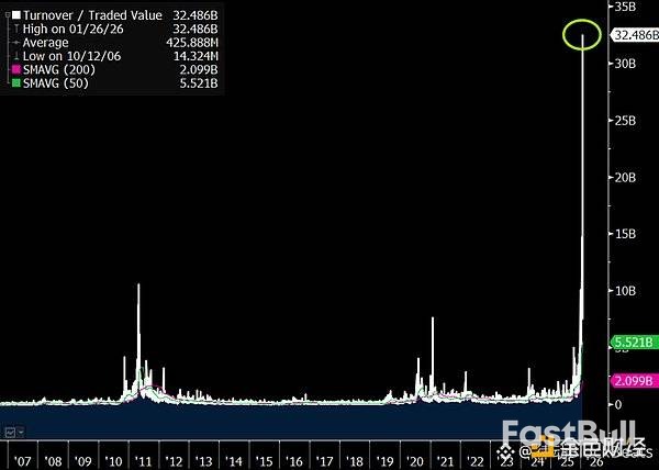 VandaTrack数据显示,仅1月份,个人投资者就向白银ETF净注入了创纪录的10亿美元。这股狂热在1月26日达到顶峰,当天白银ETF(SLV)的交易额高达394亿美元,几乎追上了标普500指数ETF(SPY)的419亿美元。一个单一品种的ETF,热度直逼美股大盘。