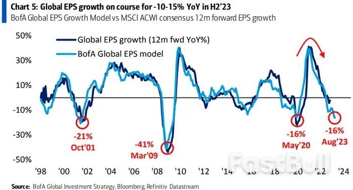 按照美银全球公司业绩模型预测,到今年8月上市公司每股收益将同比下降16%。这更加接近历史上出现经济衰退的年份。