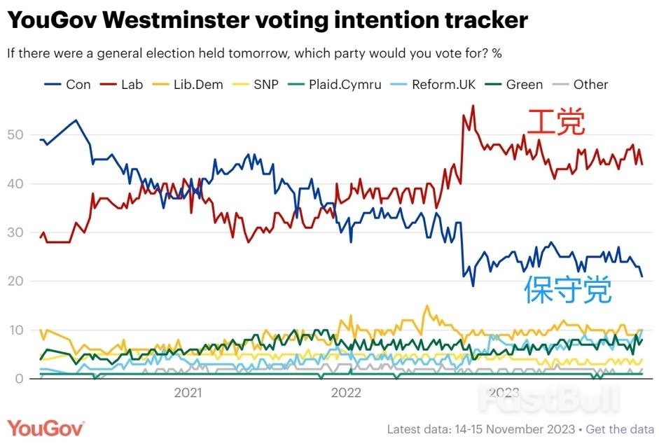 经过这一番折腾,等到苏纳克2022年底上台时,保守党在民调中与工党的差距已经稳定相差近20个百分点——保守党的支持率大概也就20个百分点左右。正因如此,苏纳克政府的官员们也不断谈及“把大选放在秋季”的考量,旨在给经济复苏争取更多的时间。