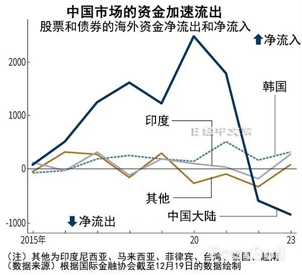 根据世界400家金融机构加入的国际金融协会(IIF)的数据进行计算,关于海外投资者的股票和债券市场的资金净流出及净流入,2023年的中国截至12月19日净流出845亿美元。与2022年相比,流出额增加了44%。
