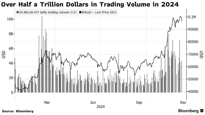 特朗普誓言要让美国成为加密货币行业的中坚力量,这引发了一波蔓延至全球的加密货币交易热潮,加剧了自2024年初美国比特币交易所交易基金(即比特币ETF)出人意料地成功推出以来,市场交易活动的频繁激增,并且一举将比特币交易价格推高至10万美元这一史诗级关口。