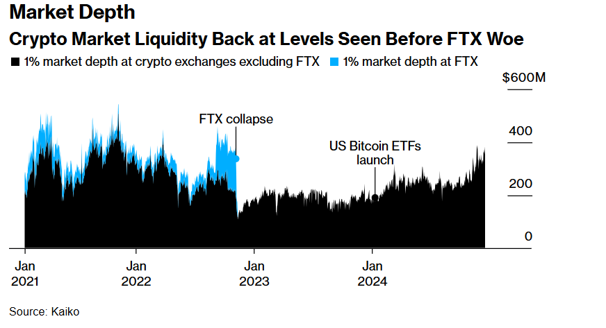 此前在2022年,FTX交易所及其姊妹对冲基金阿拉米达研究公司(Alameda Research)的彻底崩溃严重损害了加密货币市场流动性。但是自今年以来,美股市场的比特币ETF成功发行以及特朗普胜选全面触发的加密货币投资热潮帮助扭转了局面。