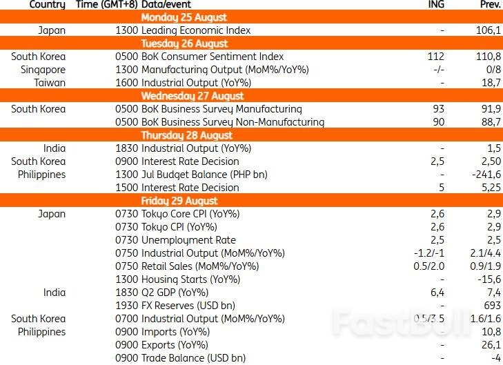 La reunión del Banco de Corea del jueves será un punto destacado de la semana. El mercado, en general, no prevé ninguna acción, pero prestará mucha atención al último informe trimestral de perspectivas macroeconómicas. Con la inflación anclada en el 2% y la proyección de un repunte del crecimiento en el segundo semestre de 2025, la estabilidad financiera sigue siendo la prioridad. El Banco de Corea probablemente esperará a que se observen señales más claras de moderación en los precios de la vivienda antes de tomar medidas. Podría elevar su previsión de PIB para 2025 del 0,8% interanual al 1,0%, y su previsión de PIB para 2026 del 1,6% al 1,7%. El PIB del segundo trimestre fue más fuerte de lo esperado. Además, es probable que el consumo se dispare en el tercer trimestre, debido principalmente a los programas gubernamentales de pagos en efectivo. Esto se reflejará en la encuesta de confianza del consumidor y las ventas minoristas de la próxima semana, que deberían mejorar en comparación con el mes anterior. Sin embargo, las perspectivas fiscales podrían ser un lastre a menos que se implementen políticas más expansivas. Asimismo, la lenta inversión en construcción debería lastrar el crecimiento general. El Banco de Corea se mantendrá cauteloso ante la incertidumbre arancelaria, aun cuando el acuerdo comercial entre Estados Unidos y Corea debería ser bien recibido por el banco central. Se espera que las perspectivas de inflación se revisen al alza hasta el 2,0 % para 2025 (frente al 1,9 % previsto para mayo), y que las perspectivas para 2026 se mantengan sin cambios en el 1,8 %. Una tasa inferior al 2 % allana el camino para una mayor flexibilización monetaria. Incluso si el Banco de Corea revisa al alza las perspectivas de crecimiento, estas seguirían estando por debajo del PIB potencial. Dado que se espera que la brecha de producción negativa persista, el Banco de Corea debería flexibilizar las condiciones monetarias, probablemente en octubre.