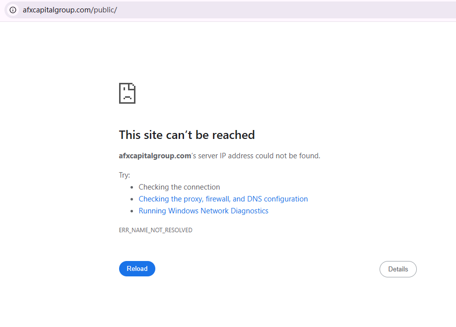 BrokersView menemukan bahwa domain "https://afxcapitalgroup.com/public/" saat ini tidak dapat diakses. Hal ini secara luas dianggap sebagai pertanda buruk yang signifikan, karena penangguhan situs web broker sering kali menunjukkan adanya masalah regulasi atau operasional yang mendasar.