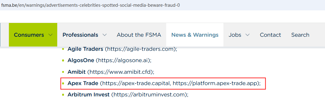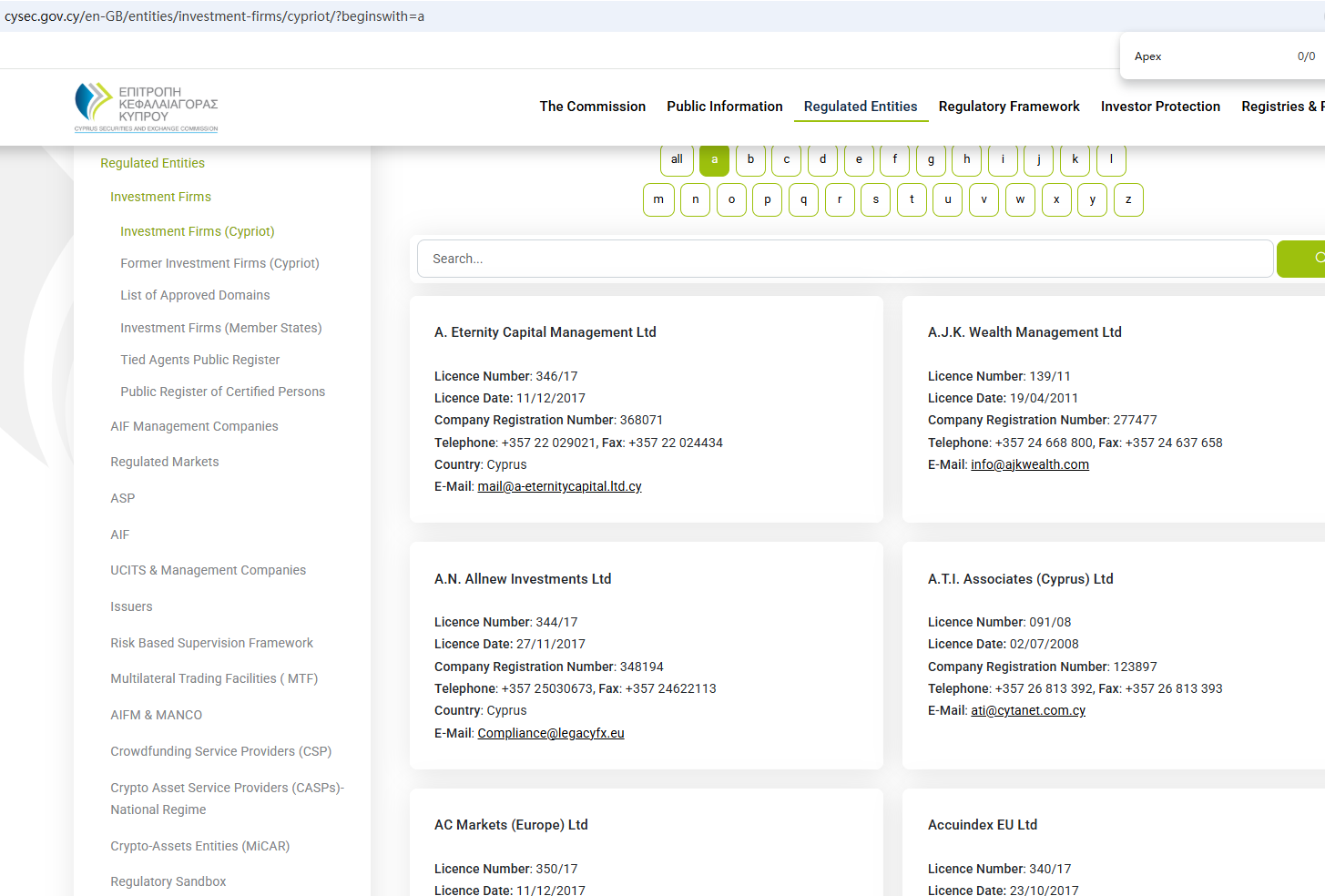 Apex Trade berlokasi di Siprus. Setelah diselidiki, tidak ditemukan informasi yang sesuai di Komisi Sekuritas dan Bursa Siprus (CySEC). Lebih lanjut, Otoritas Jasa Keuangan dan Pasar (FSMA) mengeluarkan peringatan tentang Apex Trade karena tidak memiliki otorisasi yang diperlukan.