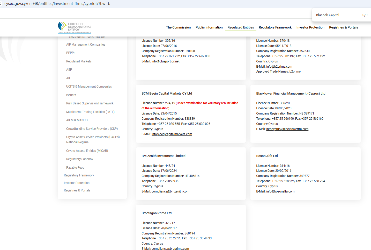 Menurut situs webnya, perusahaan ini diatur oleh Otoritas Perilaku Keuangan (FCA) dan Komisi Sekuritas dan Bursa Siprus (CySEC). Namun, pencarian tidak menemukan informasi yang cocok dengan CySEC. Lebih jauh lagi, FCA mengeluarkan peringatan mengenai Blueoak Capital, mencurigai bahwa perusahaan ini mungkin menawarkan layanan atau produk keuangan tanpa otorisasi yang diperlukan.