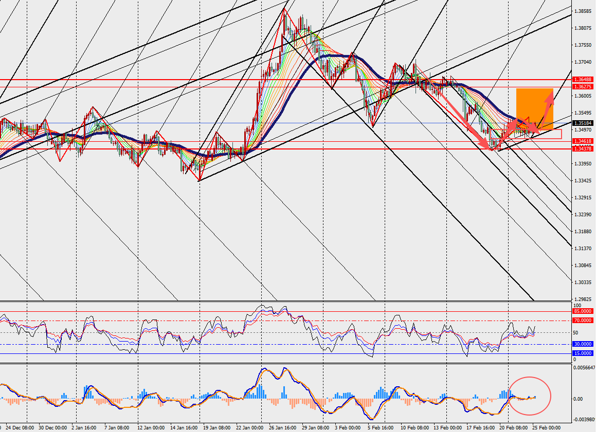 We can see GBP/USD on the H4 chart is fluctuating sideways, trading near the 48 hours moving average. Meanwhile, both the MACD double line and histogram bars are gradually expanding below the zero line. The buy limit could be used, stop loss is necessary.