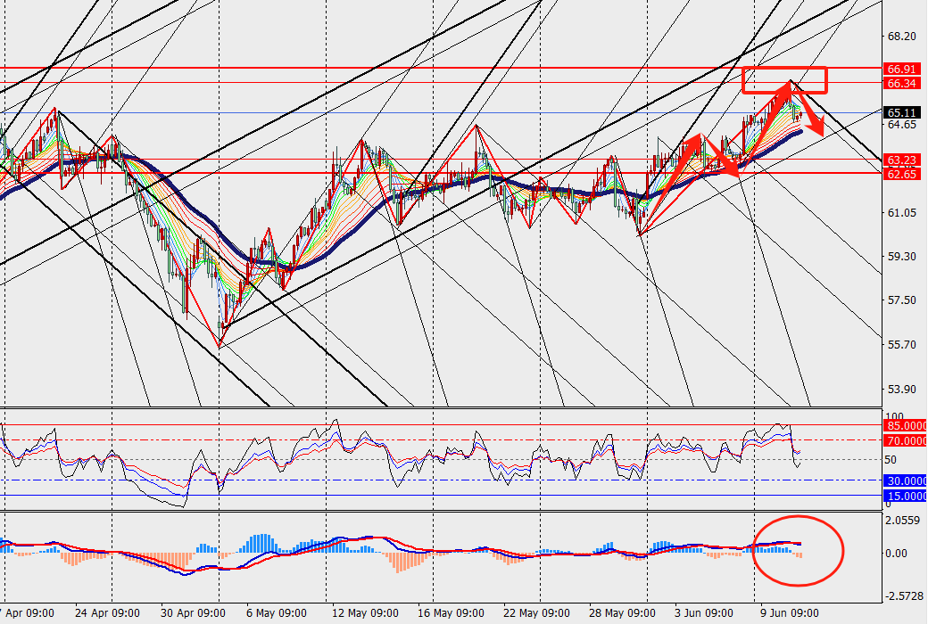 原油H4级别遇阻回落,MACD双线和量能柱在零轴上方向下扩张。美国能源信息署(EIA)周二在其月度报告中表示,由于商品价格走弱导致钻探活动减少,预计美国原油产量明年将下降。