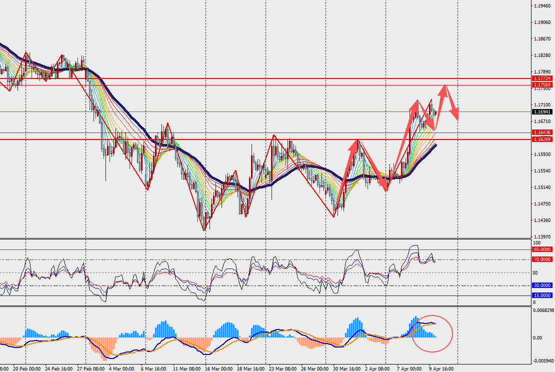 技术面: 欧元兑美元H4级别小幅震荡,并在48日多空分界线上方运行。此外,MACD双线与量能柱在零轴上方顶背离缩量。欧洲央行预计将继续坚持依赖数据、逐次会议决策的方式,并做好在适当情况下调整政策立场的准备。