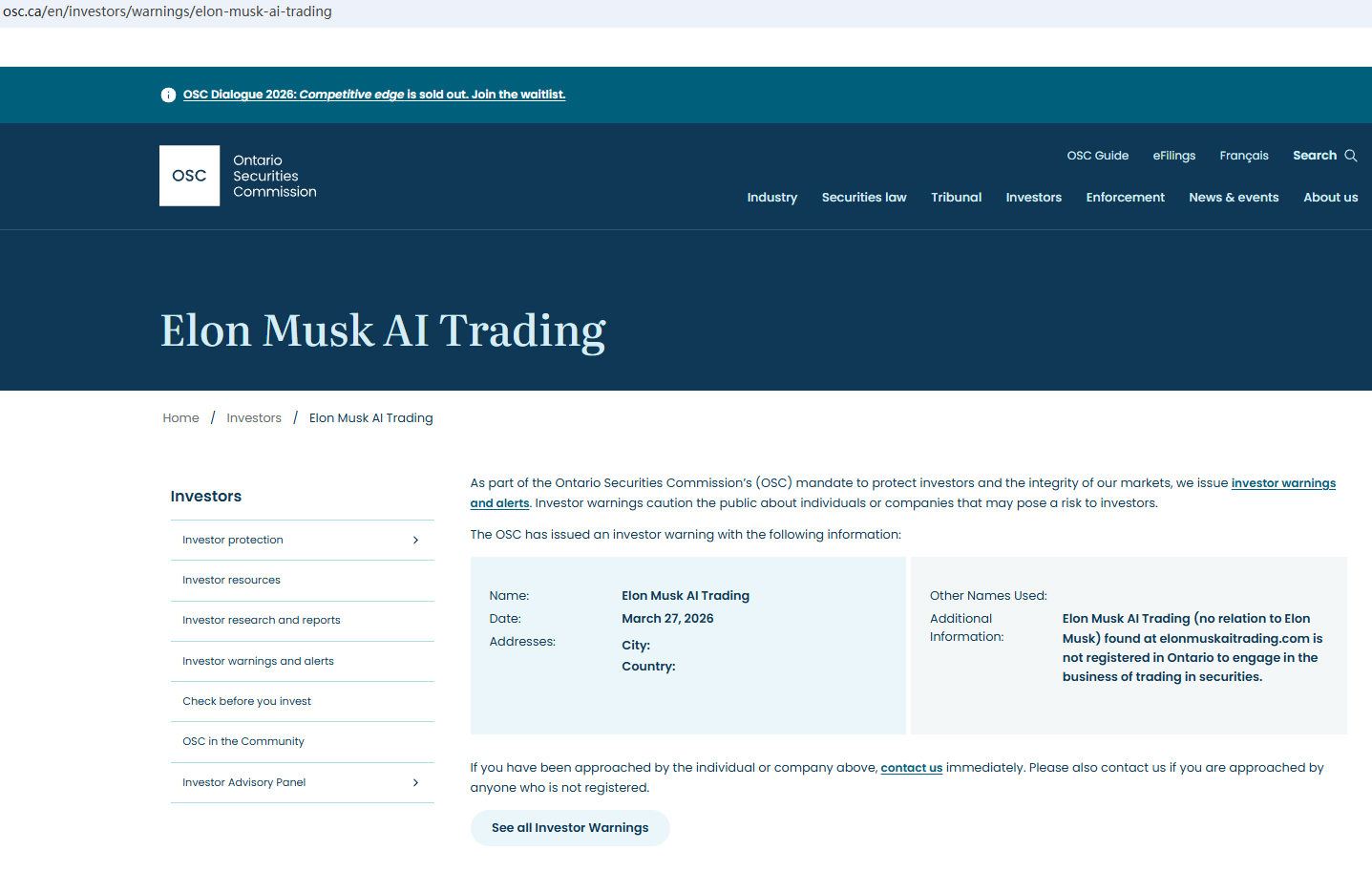 Pada tanggal 27 Maret 2026, Komisi Sekuritas Ontario (OSC) mengeluarkan peringatan terhadap Elon Musk AI Trading, karena meyakini perusahaan ini mungkin menyediakan layanan atau produk keuangan tanpa izin yang semestinya. https://www.osc.ca/en/investors/warnings/elon-musk-ai-trading