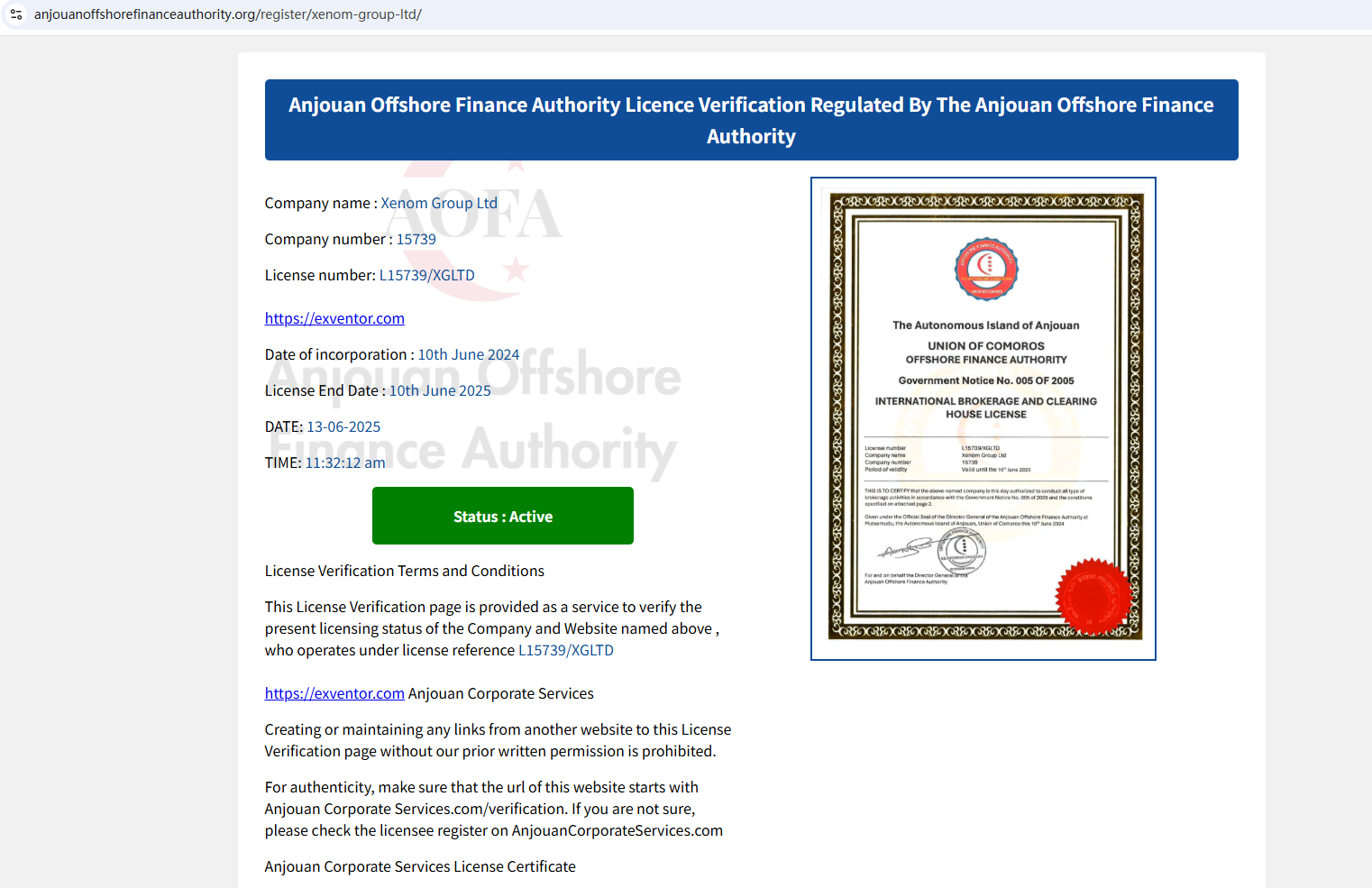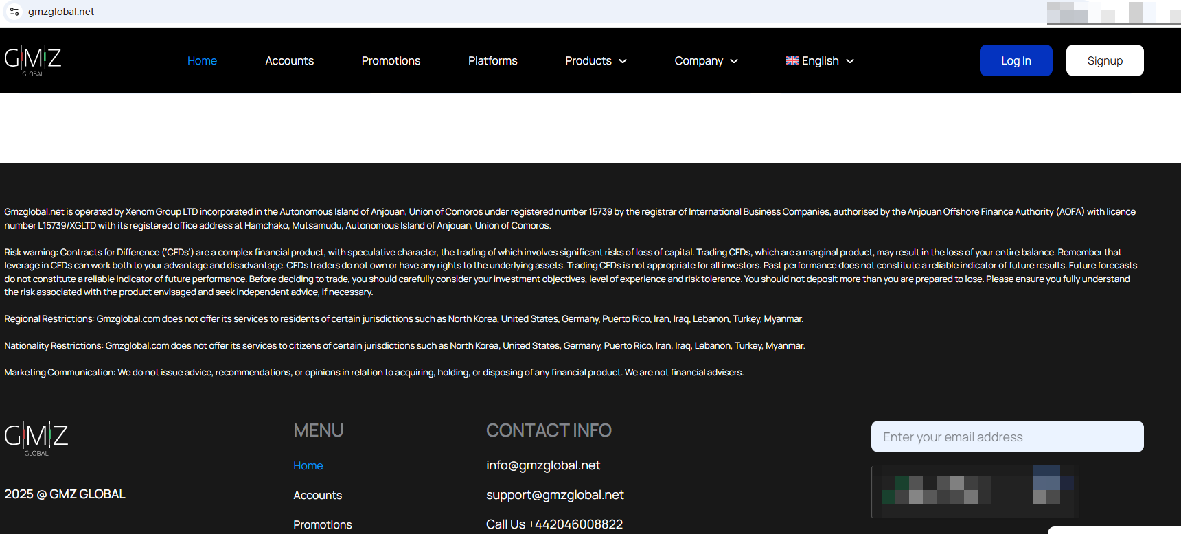 GMZ Global mengklaim dioperasikan oleh Xenom Group Ltd yang didirikan di Pulau Otonom Anjouan, Uni Komoro dengan nomor terdaftar 15739 oleh pencatat Perusahaan Bisnis Internasional, yang disahkan oleh Otoritas Keuangan Lepas Pantai Anjouan (AOFA) dengan nomor lisensi L15739/XGLTD, menawarkan berbagai produk investasi kepada para pedagang, termasuk Forex, Komoditas, Saham, Indeks, Cryptocurrency, dan instrumen lainnya untuk perdagangan di pasar global.