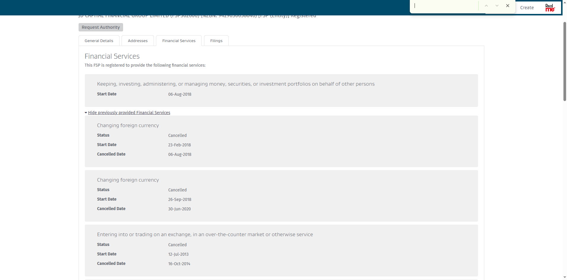 First, the registration does not list any associated website domains, making it impossible to confirm definitively that the JDFX platform is officially linked to the registered entity. Second, and more importantly, the record indicates that JDFX does not hold authorization to provide retail financial services. Furthermore, many of the listed financial services under this registration are marked as "cancelled."