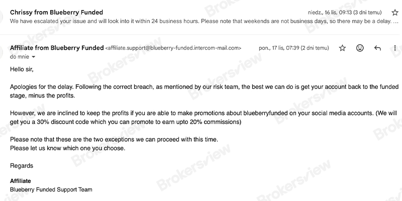 Setelah menolak pembayaran dan gagal memberikan data spesifik terkait pelanggaran, platform tersebut tidak memberikan penjelasan melalui departemen risikonya. Sebaliknya, trader tersebut menerima email proposal dari "Tim Dukungan Afiliasi".