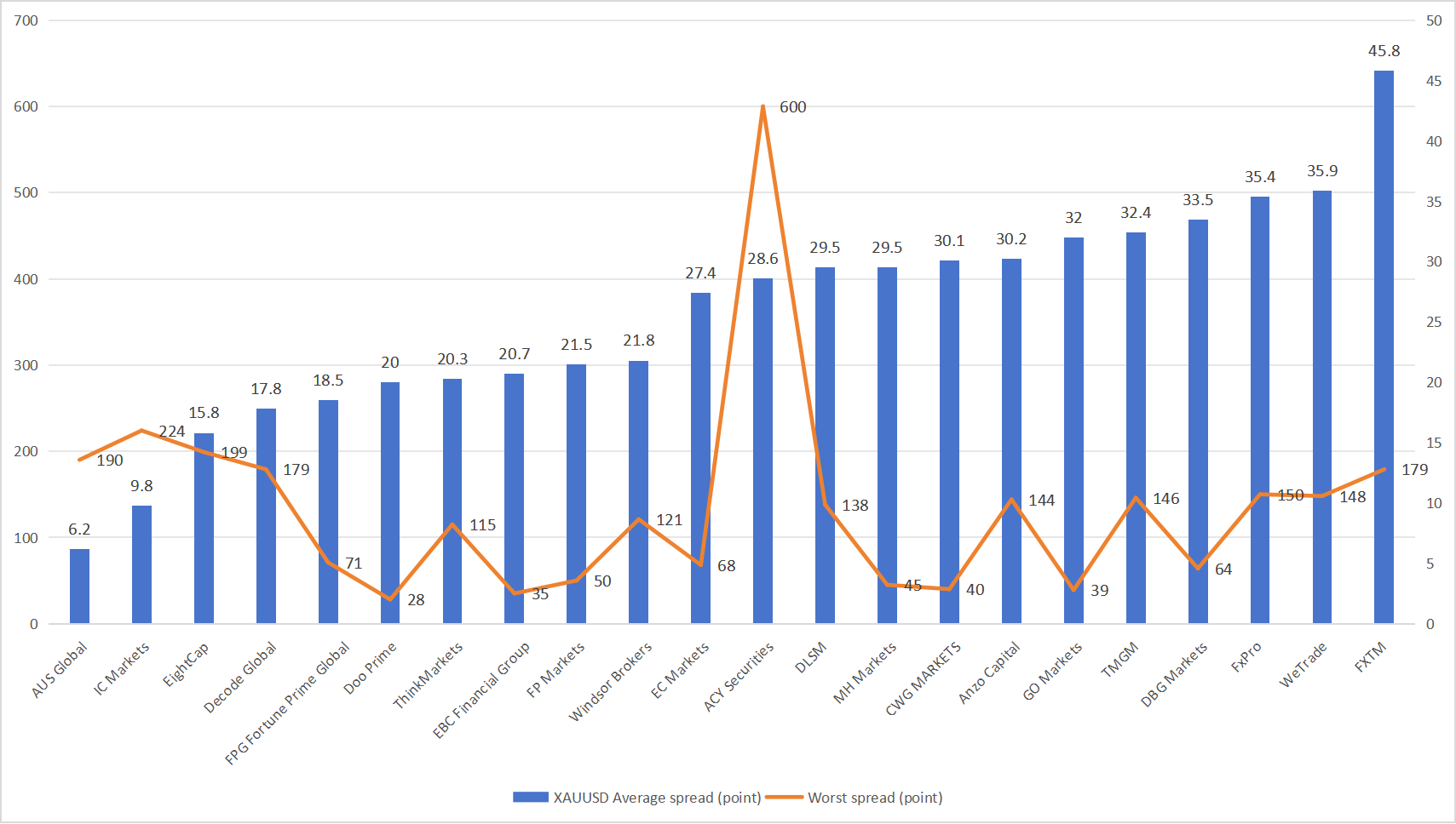 AUS Global : Spread rata-rata 2,1 poin, spread maksimum 150 poin.