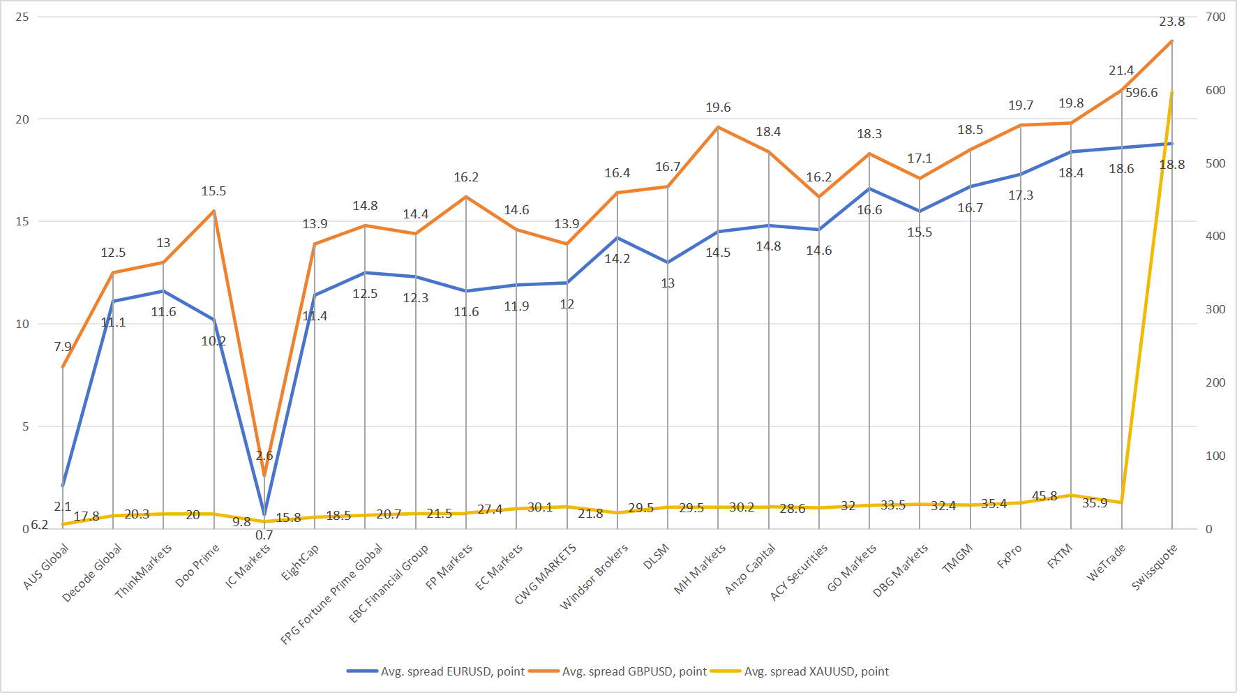 Dalam industri perdagangan valas, spread memegang peranan penting karena spread mewakili biaya perdagangan yang ditanggung oleh investor. BrokersView telah membandingkan secara saksama spread rata-rata dari tiga instrumen perdagangan utama (EUR/USD, GBP/USD, dan XAU/USD) di antara 23 broker valas paling populer di pasar. Analisis komprehensif ini bertujuan untuk membantu para pedagang menemukan platform perdagangan valas yang paling sesuai hanya dalam waktu tiga menit.