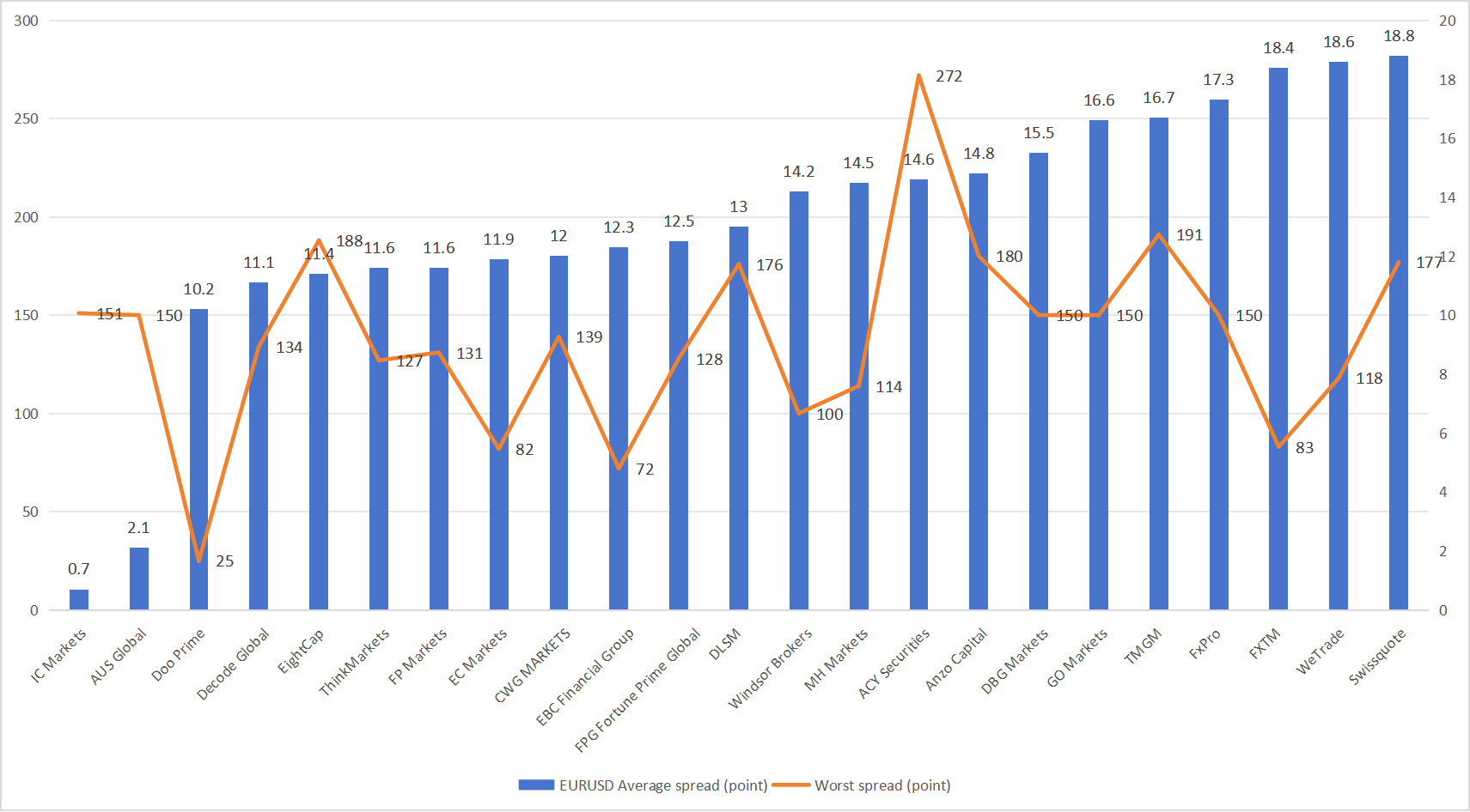 IC Markets : Spread rata-rata 9,8 poin, spread maksimum 224 poin.