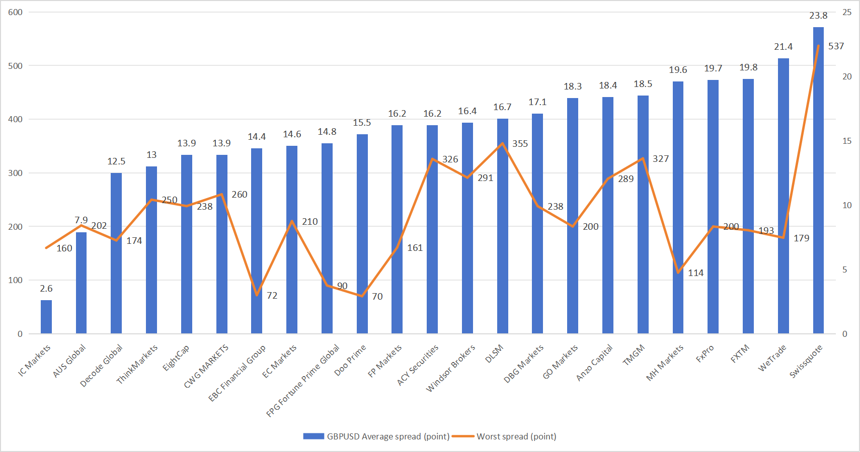 GBP/USD memiliki spread yang relatif lebih tinggi, dipengaruhi oleh likuiditas pasar, volatilitas, dan strategi penetapan harga broker.