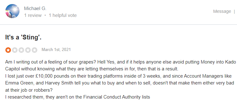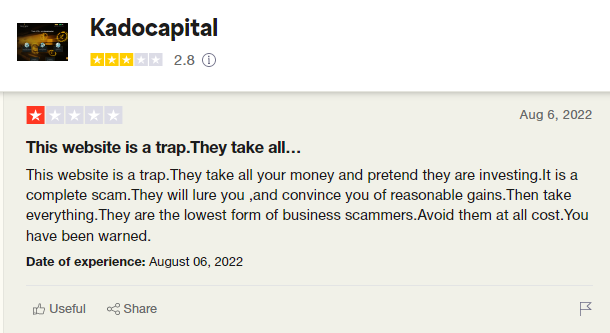 Kado Capital memegang opini terburuk di antara klien. Investor telah menilainya sebagai broker penipuan berdasarkan kode etiknya yang buruk. Menurut klien, perusahaan memanipulasi harga selain menahan dana tanpa alasan apapun. Pelanggan juga menuduh perusahaan sengaja memberikan leverage yang berlebihan untuk menghapus akun klien lebih cepat. Anda mungkin menemukan banyak keluhan tentang broker di berbagai situs web pengulas independen seperti BrokersView.