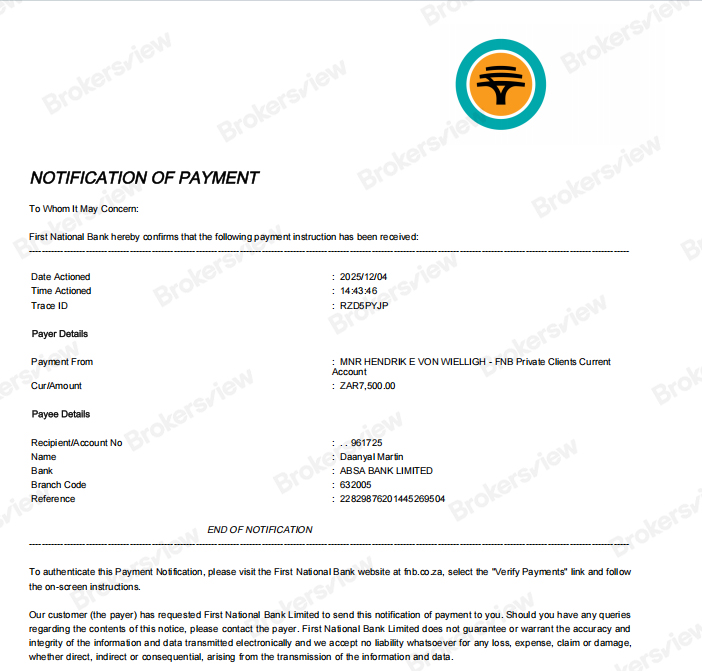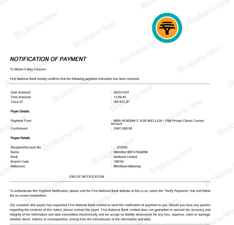 Pemberitahuan Pembayaran yang diberikan oleh pengadu menunjukkan bahwa dana awalnya mengalir keluar dalam mata uang fiat. Pada tanggal 1 Desember 2025, pengadu mentransfer R1.000 melalui rekening FNB ke penerima bernama "9bb500a18f81479e8098" di Nedbank. Hanya tiga hari kemudian, pada tanggal 4 Desember, ia mentransfer R7.500 lagi ke rekening pribadi bernama "Daanyal Martin" di Absa Bank.