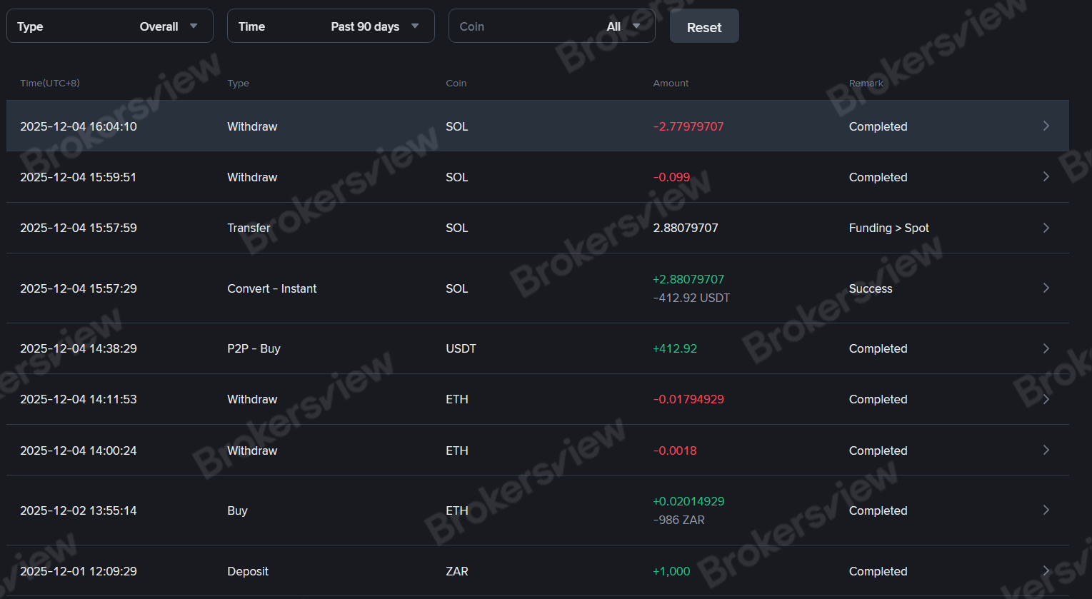 Di bawah kendali jarak jauh mereka, dana ini tidak masuk ke platform secara langsung, tetapi terlebih dahulu masuk ke akun Binance milik pengadu. Catatan riwayat aset Binance dengan jelas mendokumentasikan proses ini: pada sore hari tanggal 4 Desember 2025, dana tersebut dengan cepat dikonversi menjadi USDT dan SOL, dan kemudian ditarik dalam beberapa menit. Pengadu percaya bahwa ia sedang mendanai akun investasi, tetapi uang tersebut akhirnya mengalir ke GTC Management. Serangkaian operasi ini mengubah apa yang seharusnya menjadi transfer bank yang dapat dilacak menjadi transaksi on-chain yang sulit dilacak.