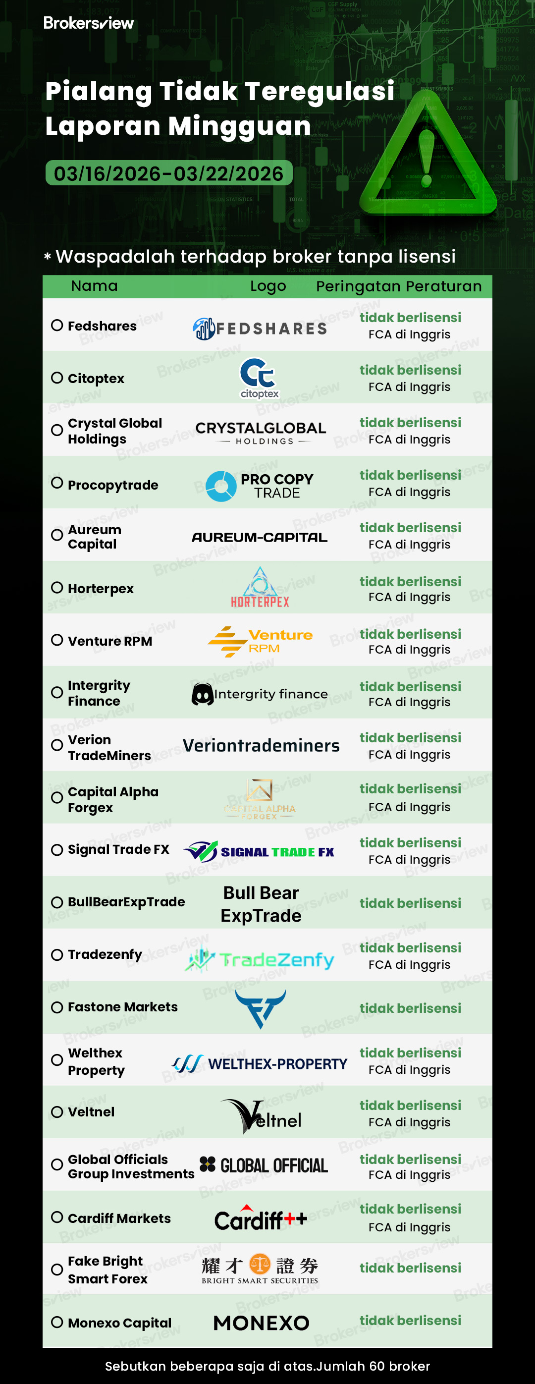 Selama pekan tanggal 16–22 Maret 2026, Brokersview telah menyusun daftar 60 entitas yang telah ditandai karena beroperasi tanpa izin regulasi atau karena menerima peringatan resmi dari Otoritas Perilaku Keuangan Inggris (FCA).