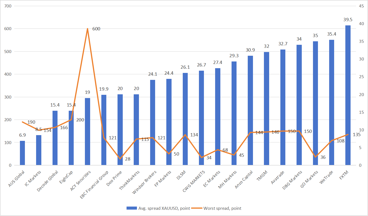 Untuk spread terburuk , ACY Securities menawarkan spread terburuk yang signifikan , yaitu 600 pip, untuk XAU/USD, yang merupakan tanda bahaya utama bagi para trader. Doo Prime menawarkan spread terburuk yang jauh lebih kompetitif, yaitu 28 pip , menjadikannya pilihan yang lebih baik bagi mereka yang berdagang emas.