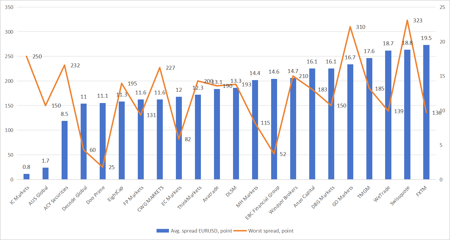 Namun, spread terburuk untuk EUR/USD menunjukkan variasi yang signifikan, terutama untuk IC Markets , di mana spread terburuknya dapat mencapai 250 pip , sebuah lompatan yang signifikan dari spread rata-ratanya. Di sisi lain, AUS Global memiliki spread terburuk yang lebih terkendali, yaitu 150 pip .