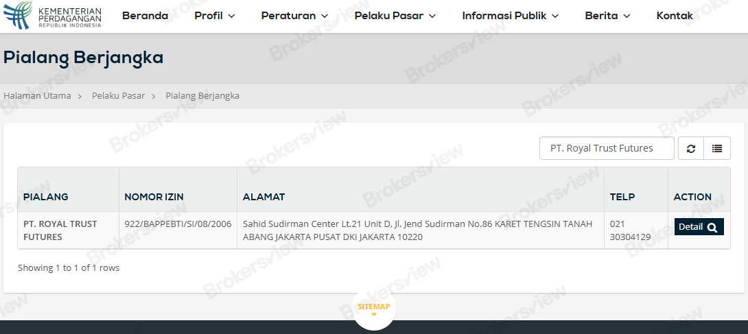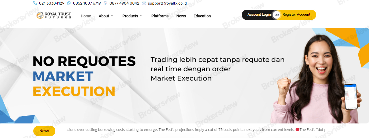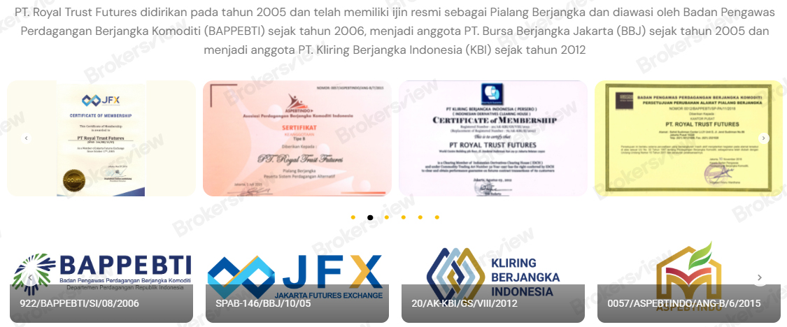 Royal Trust Futures, yang didirikan pada tahun 2005 dan diatur oleh BAPPEBTI sejak tahun 2006, mengklaim menyediakan berbagai layanan dalam perdagangan berjangka multilateral dan derivatifnya, termasuk emas, mata uang, dan minyak mentah. Perusahaan mengatakan pihaknya berupaya untuk menjaga kepuasan pelanggan melalui layanan pelanggan 24/7, mengamankan rekening terpisah untuk dana pelanggan dan materi panduan yang ekstensif. Terlepas dari pernyataan ini, karena ada beberapa masalah dengan broker ini, calon klien harus berhati-hati dan melakukan uji tuntas secara menyeluruh.