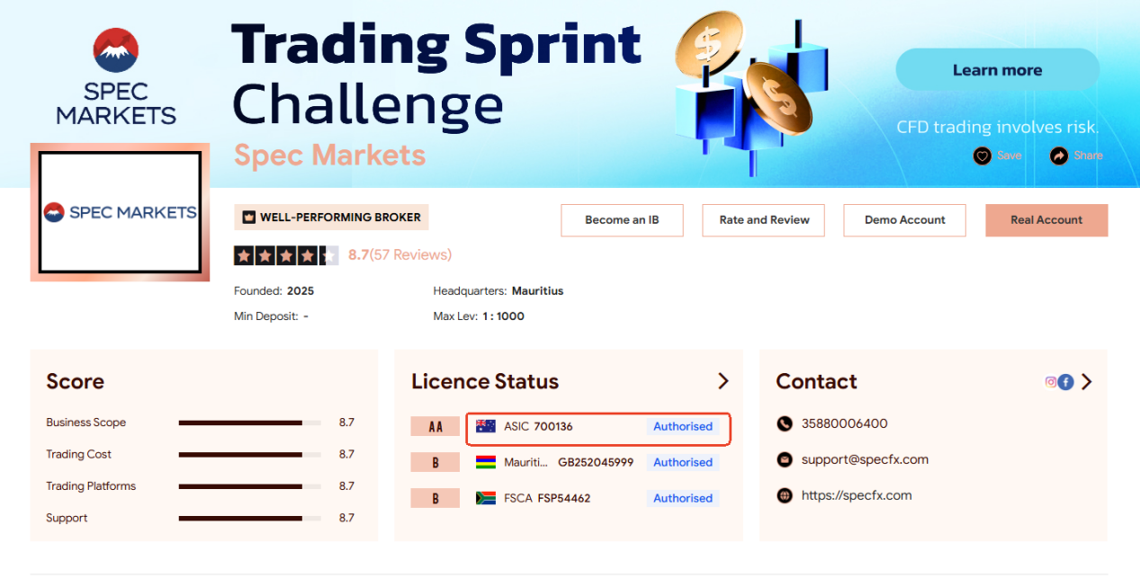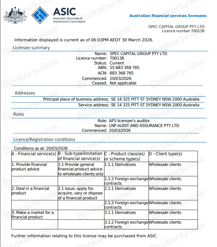 Brokersview telah mengetahui bahwa Spec Capital Group telah memperoleh lisensi Layanan Keuangan Australia (AFS) (No. 700136) dari Komisi Sekuritas dan Investasi Australia (ASIC), yang memungkinkan entitas lokalnya, Spec Capital Group Pty Ltd, untuk menyediakan layanan kepada klien grosir. Spec Markets adalah nama dagang dari Spec Capitals Ltd.