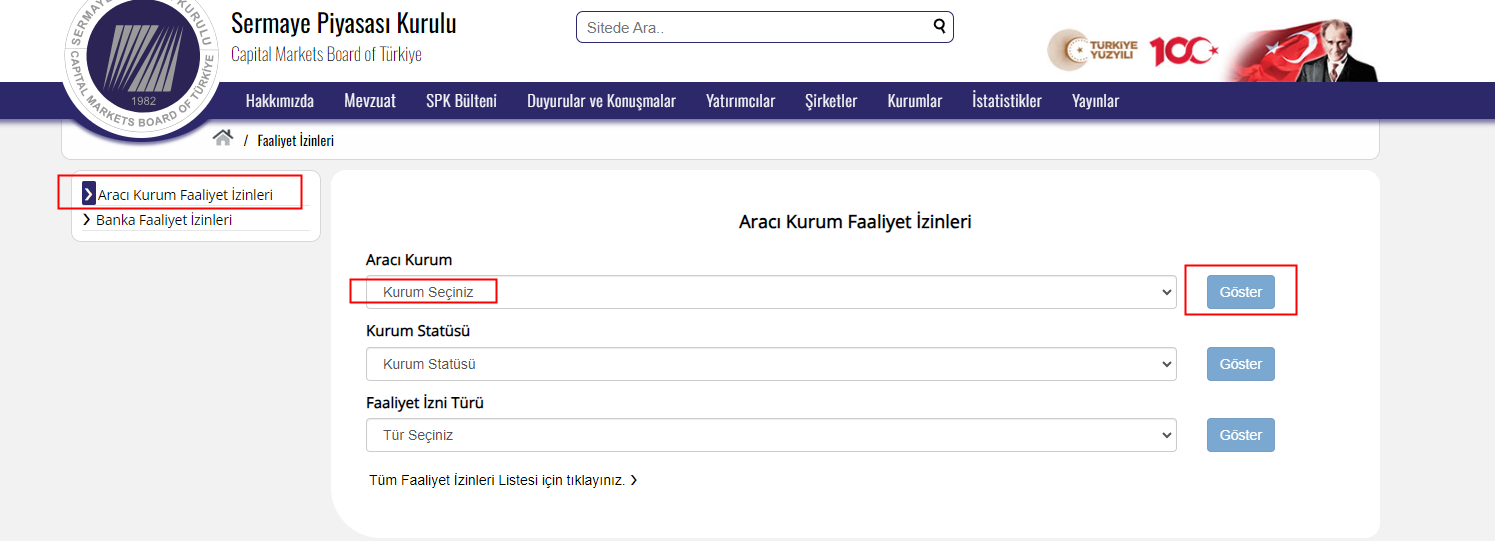 Untuk memverifikasi status lisensi broker di Turki, investor dapat mengakses database CMB melalui tautan yang disediakanhttps://spk.gov.tr/faaliyet-izinleri/araci-kurumlar.