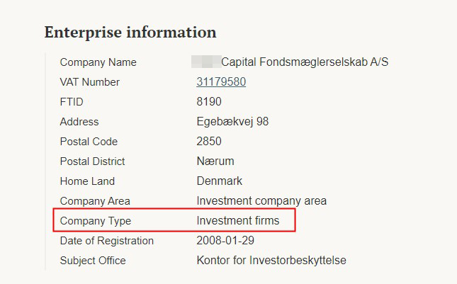Secara umum, profil broker yang diatur oleh FSA Denmark akan ditemukan di halaman Daftar Perusahaan di situs web FSA Denmark. Cobalah untuk menemukannya dan periksa apakah cocok dengan info dari situs web broker.