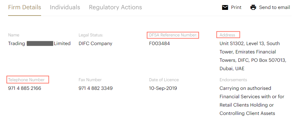 4. Jika semua langkah di atas sudah dilakukan, jangan lupa untuk mengecek informasi yang paling penting: cek apakah detail perusahaan yang dipublikasikan di situs DFSA sesuai dengan perusahaan yang akan Anda gunakan untuk bertransaksi, terutama situs web dan email, dsb. Jika tidak, mohon jangan hubungi broker tersebut karena bisa jadi itu adalah perusahaan yang tidak berizin dan uang Anda akan terancam.