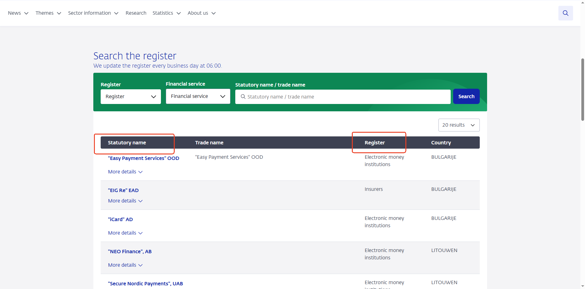 2. Masukkan nama dagang/nama entitas ke dalam kolom pencarian di https://www.dnb.nl/en/public-register/?p=1&l=20