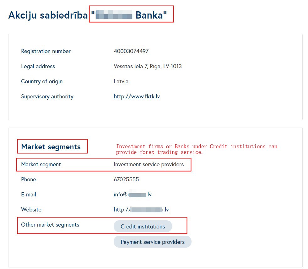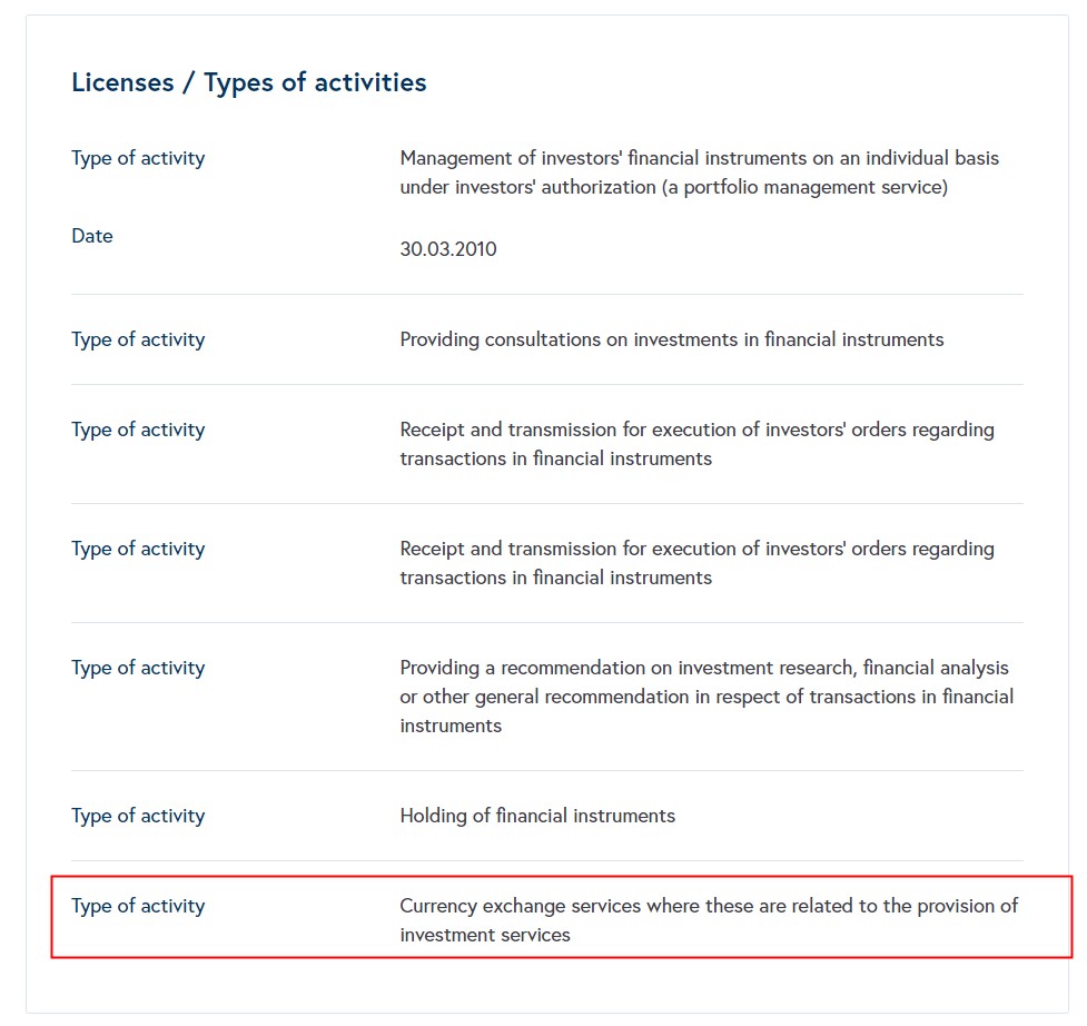 3. Dan Anda akan mendapatkan konten broker di situs web FKTK. Saat ini Anda perlu memeriksa 'Segmen pasar' dan 'Lisensi / Jenis kegiatan': periksa apakah broker tersebut termasuk dalam 'Penyedia layanan investasi' atau 'Bank' di bawah 'Lembaga kredit' dan memiliki otorisasi untuk menyediakan 'Layanan penukaran mata uang jika ini terkait dengan penyediaan layanan investasi';
