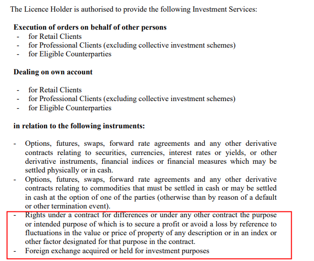 3. Dan Anda akan mendapatkan konten broker di situs web MFSA. Saat ini Anda akan memeriksa 'Kategori Lisensi' dan unduh file terlampir untuk memeriksa apakah pialang memiliki otorisasi untuk memberikan 'Hak berdasarkan kontrak untuk perbedaan atau maksud atau tujuan yang dimaksudkan dengan mengacu pada fluktuasi nilai di bawah kontrak lain apa pun, mengamankan keuntungan atau menghindari kerugian atau harga untuk properti dari deskripsi apa pun atau dalam indeks atau faktor lain yang ditetapkan untuk tujuan itu dalam kontrak' atau 'Valuta asing diperoleh atau dimiliki untuk tujuan investasi'.