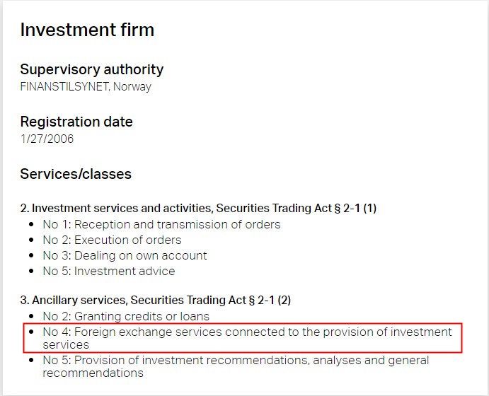 3. Dan Anda akan mendapatkan profil pialang di situs web FSA Norwegia. Saat ini Anda perlu memeriksa apakah pialang tersebut adalah 'Perusahaan investasi' dan memiliki otorisasi untuk menyediakan 'No. 4: Layanan valuta asing yang terkait dengan penyediaan layanan investasi' berdasarkan 'Layanan tambahan, Undang-Undang Perdagangan Efek § 2-1 (2)';