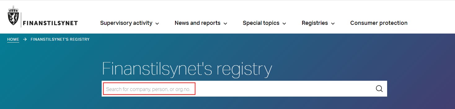 2. Masukkan nomor atau nama FT ke dalam bilah pencarian di https://www.finanstilsynet.no/en/finanstilsynets-registry/;