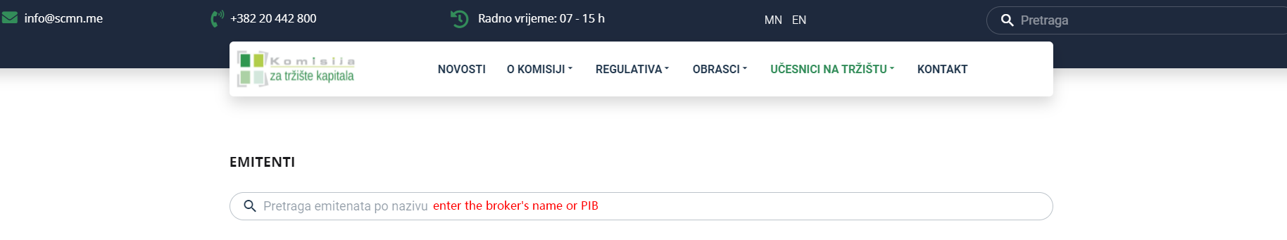 2. Masukkan PIB atau nama ke bilah pencarian di https://www.scmn.me/en/ucesnici -na-trzistu/emitenti