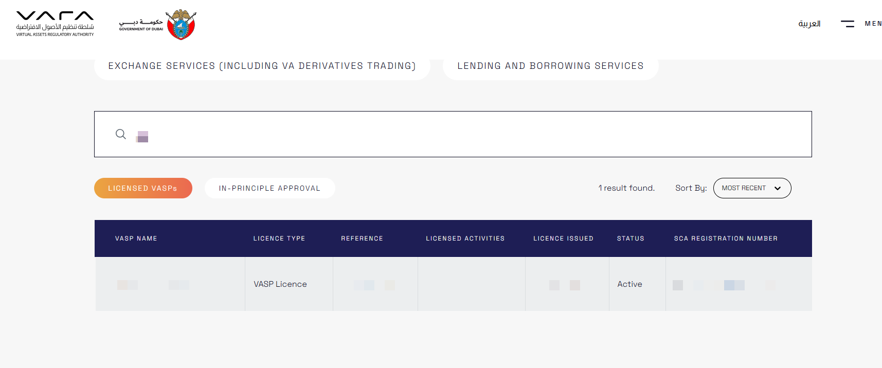 Setiap Penyedia Layanan Aset Virtual (VASP) yang ingin beroperasi di Dubai harus mengajukan dan memperoleh lisensi dari VARA sebelum memulai aktivitas. Sebuah VASP dapat menjalankan beberapa aktivitas di bawah satu lisensi, kecuali untuk Layanan Penitipan, yang harus dilakukan oleh badan hukum terpisah dengan lisensi khusus tersendiri. Hal ini memastikan perlindungan aset yang tepat dan tata kelola yang independen.