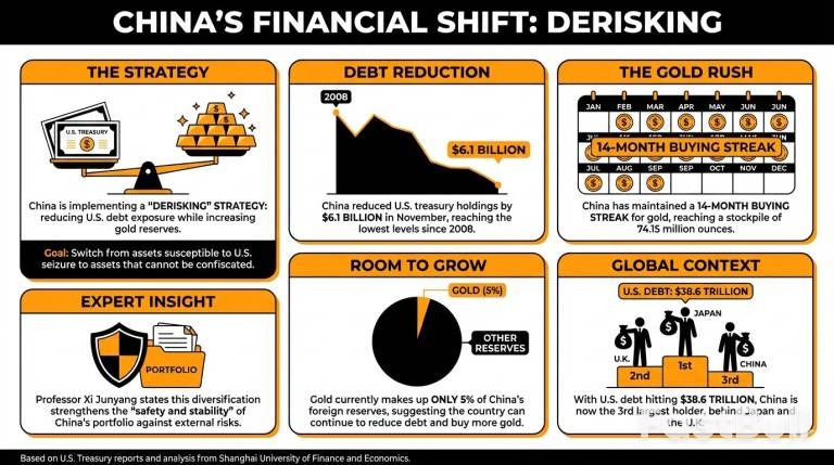 China tampaknya mempercepat strategi "pengurangan risiko" dengan secara sistematis mengurangi eksposurnya terhadap utang pemerintah AS sambil meningkatkan cadangan emasnya. Pergeseran keuangan ini mencerminkan kebijakan yang lebih luas untuk mendiversifikasi aset di tengah ketegangan geopolitik yang sedang berlangsung.