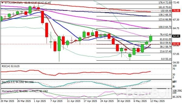 Kontrak WTI melanjutkan reli kuat minggu lalu (naik hampir 8%) pada hari Senin dan mencapai titik tertinggi dalam dua minggu, menandai retracement lebih dari 76,4% dari $64,70/$55,14 bear leg.