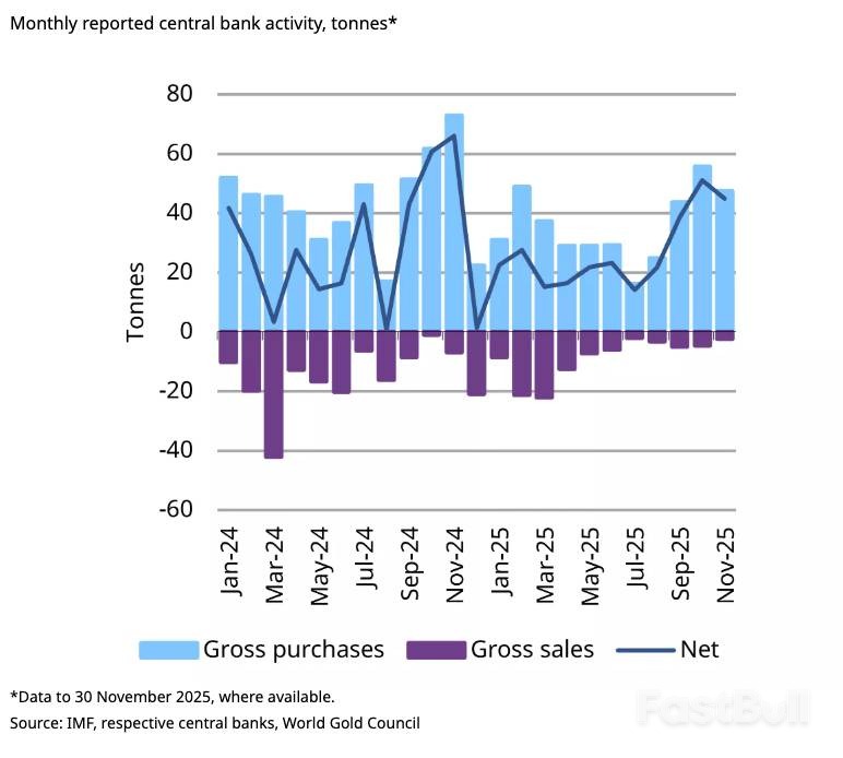 Data resmi menunjukkan bahwa bank sentral secara kolektif menambahkan 45 ton emas lagi ke cadangan mereka pada bulan November. Meskipun ini sedikit menurun dari 53 ton yang diperoleh bulan sebelumnya, hal ini mencerminkan tingkat pembelian yang berkelanjutan dan tinggi dibandingkan dengan awal tahun 2025.