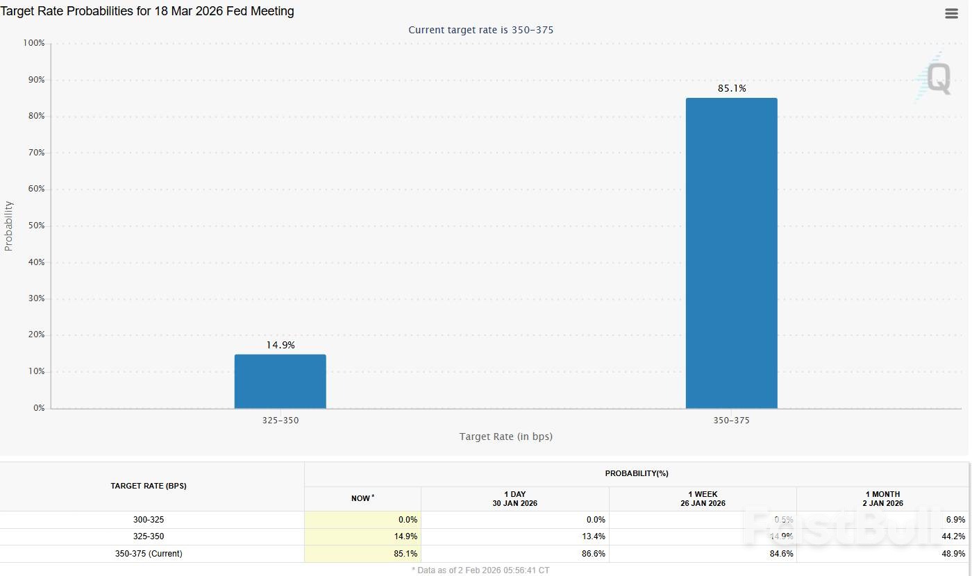 Untuk saat ini, ekspektasi pasar terhadap kebijakan suku bunga belum berubah secara dramatis. Data dari alat FedWatch milik CME Group menunjukkan bahwa 85% pelaku pasar memperkirakan suku bunga akan tetap tidak berubah pada pertemuan Fed berikutnya pada tanggal 18 Maret.