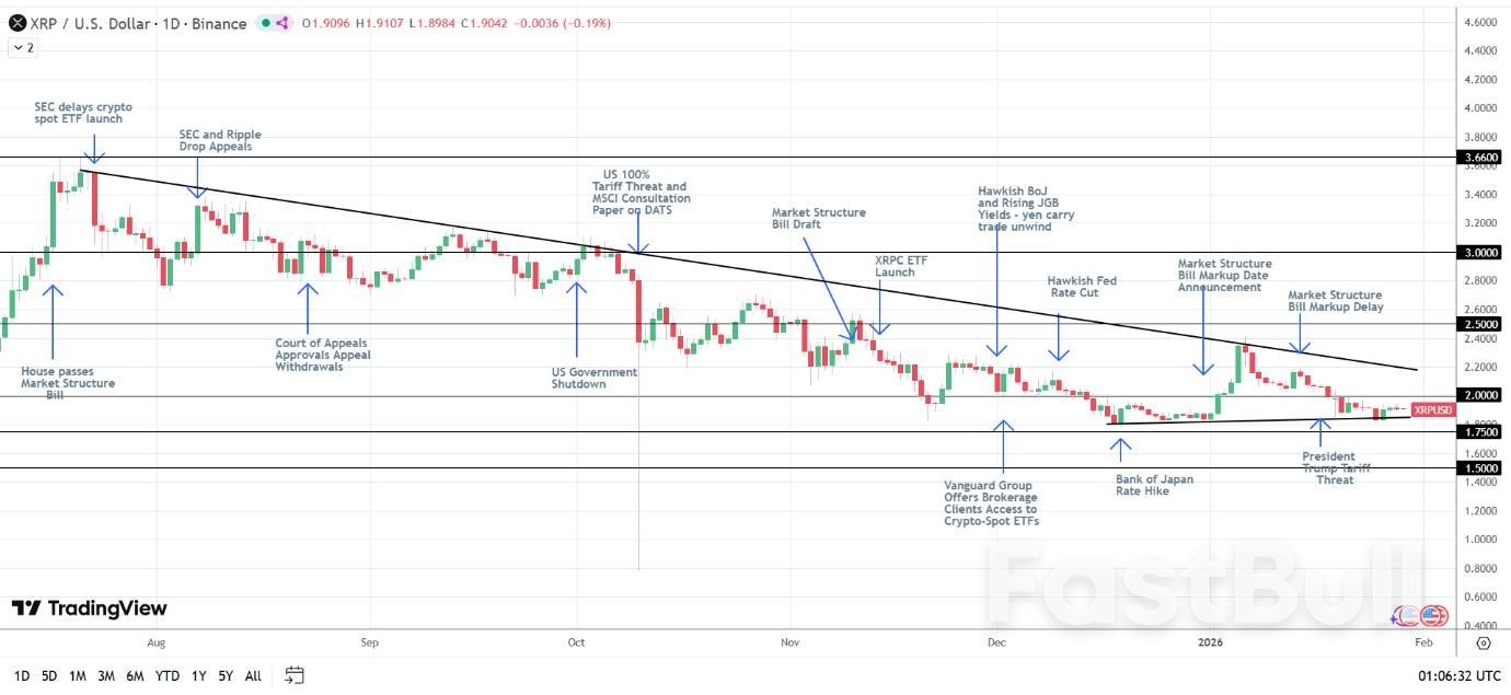 Token tersebut melonjak dari $1,8103 pada 31 Desember ke level tertinggi $2,4151 pada 6 Januari sebagai respons terhadap pengumuman kenaikan suku bunga oleh Komite Perbankan pada 15 Januari. Namun, penundaan kenaikan suku bunga oleh Komite Perbankan dan Komite Pertanian memicu pembalikan tren. XRP turun ke level terendah $1,8113 pada 25 Januari sebelum kembali naik ke $1,9.