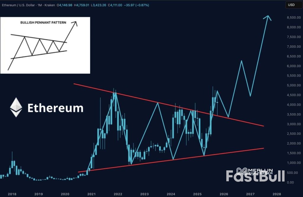 Harga telah diperdagangkan dalam garis tren yang menyempit, dengan titik terendah yang lebih tinggi mendekati $1.500 dan titik tertinggi yang lebih rendah mendekati $4.000. Merlijn menyatakan bahwa pola ini "sejati" dan tidak didasarkan pada spekulasi, melainkan pada akurasi teknis. Grafik memproyeksikan penembusan pada tahun 2026, berpotensi mencapai $8.500.