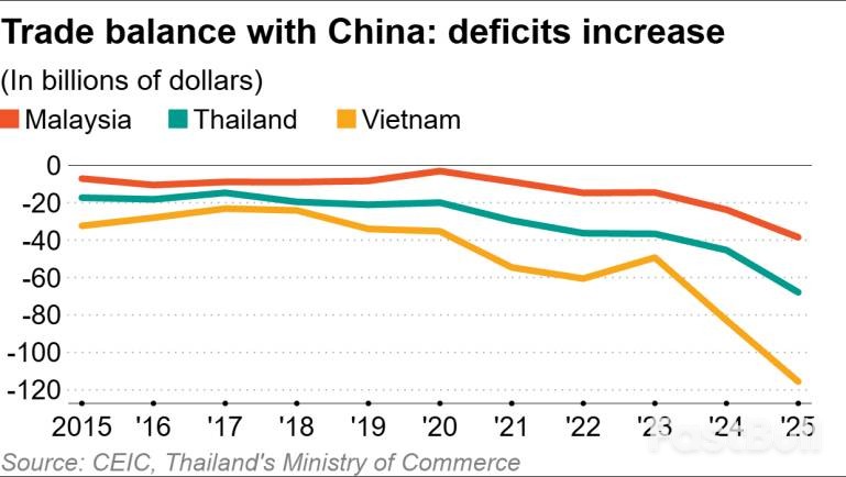 Pada tahun 2025, defisit perdagangan Malaysia dengan China melebar sebesar 62% menjadi $38,4 miliar. Defisit Thailand tumbuh 50% menjadi $67,8 miliar, dan defisit Vietnam meningkat sebesar 40% menjadi $115 miliar.