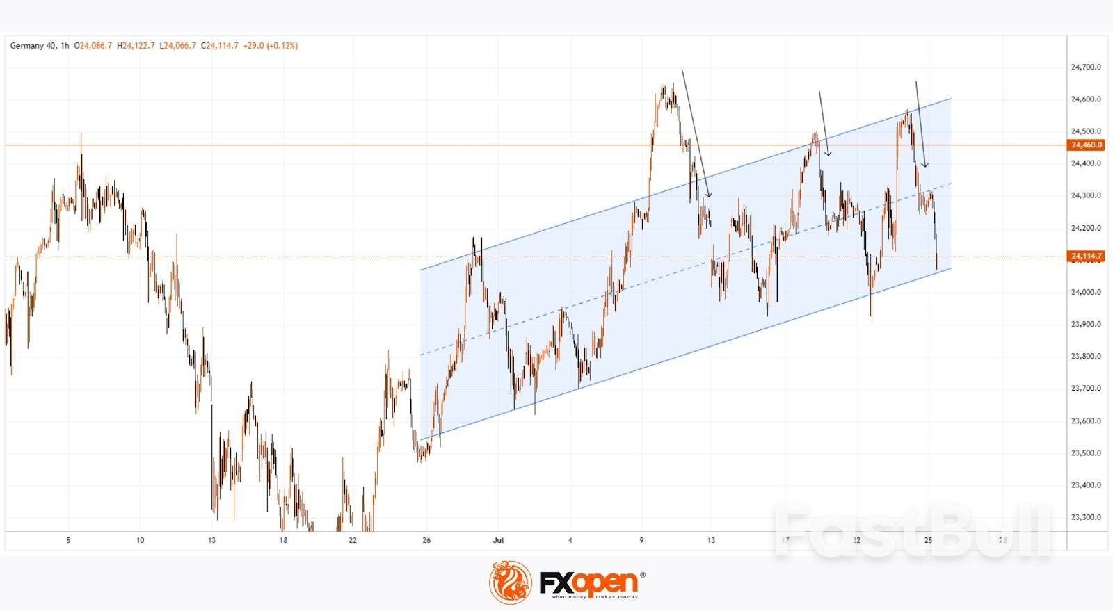 From a technical analysis perspective, the DAX 40 (Germany 40 mini on FXOpen) formed an ascending channel in July (outlined in blue). However, each time the bulls attempted to push the price above the 24,460 level (which corresponds to the May high), they encountered resistance.
